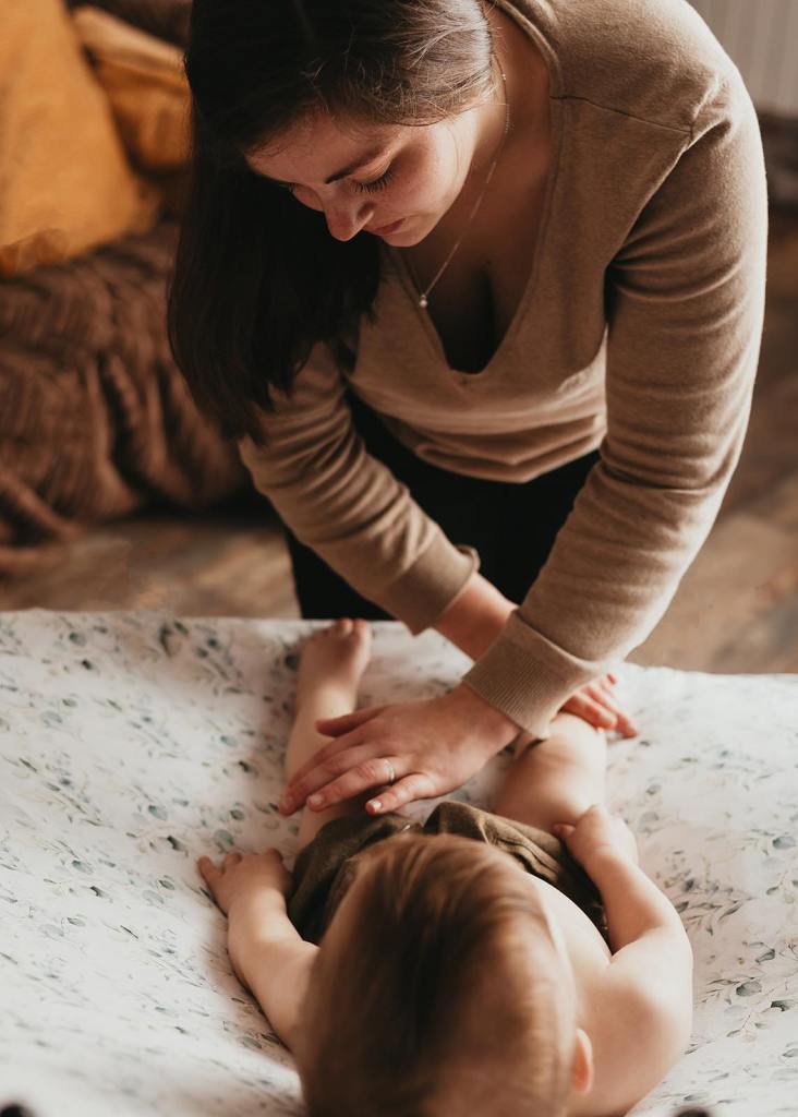 Lors du massage il est important d’exercer une petite pression, comme lorsque nous appliquons de la crème solaire par exemple. Pensez à enlever vos bagues pour plus de confort pour bébé. Vous pouvez masser bébé sur un petit matelas, ou un endroit agréable pour lui. Si bébé n’apprécie pas d’être trop à plat, n’hésitez pas à lui proposer un coussin d’allaitement.