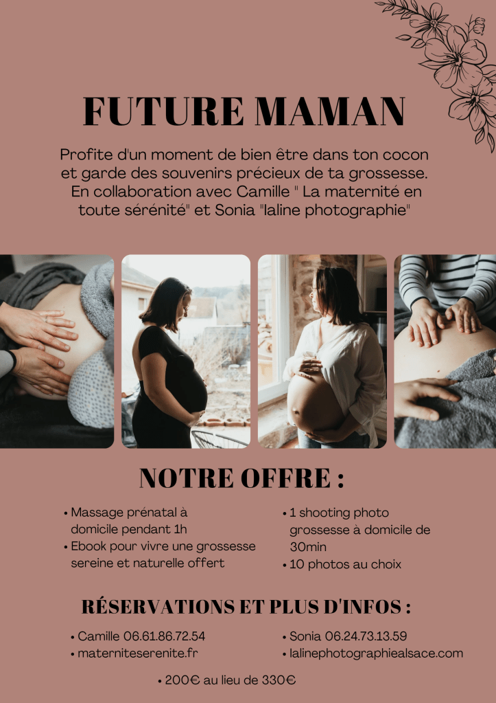 Immortalise ta grossesse lors de 30min de shooting à ton domicile, pour plus de confort puis profite d’un massage prénatal (spécialement conçu pour les femmes enceintes à partir du deuxième trimestre)